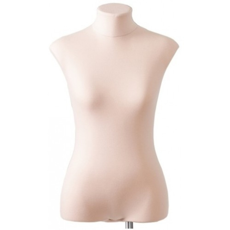 Основа манекена – эластичный пенополиуретан. Обтяжка выполнена из трикотажа. Размер модели – 44, женский. Манекен представлен в бежевом цвете.