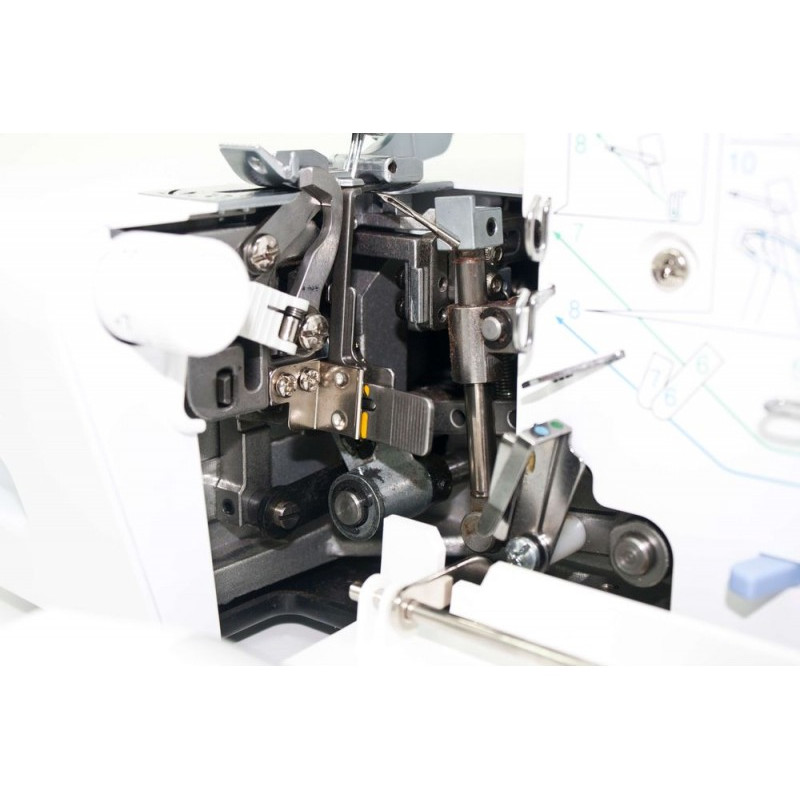 Стоит отметить, что производители постарались максимально упростить наиболее сложный момент в эксплуатации любого оверлока, а именно – заправку петлителей. С этой целью у данной оверлочной машины на откидной внутренней панели имеются направляющие разного цвета, указывающие пошаговую систему заправки. Все это значительно упрощает и ускоряет процесс заправки нижнего петлителя.