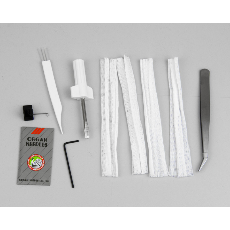 | Комплектация | Лапка универсальная (стоит на машине) Щеточка для очистки Отвертка Пинцет Шестигранный ключ Сетка (4 шт.) Комплект иголок № HA*1 80/12 — 2шт.; 90/14 — 2 шт. Колпачки держателя катушки — 4 шт. Мусоросборник Мягкий чехол Педаль Инструкция на русском языке Характеристики Прошиваемые материалы для всех типов ткани |