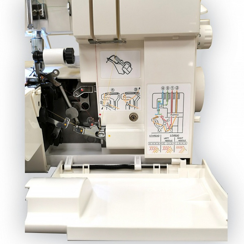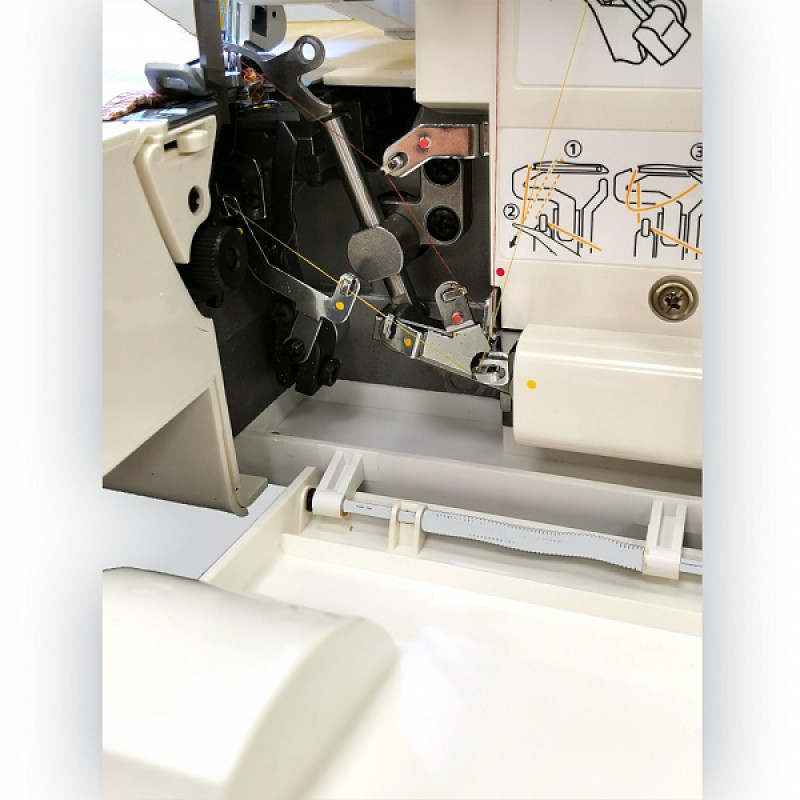 Для заправки нижних конструктивно предусмотрен открытый доступ. Широкий просвет, благодаря откидной защитной крышке, поможет справиться без пинцета. Путь каждой из вдеваемых нитей выделен цветом, начиная с самого начала — от катушкодержателя. Съемная рукавная платформа оставляет после себя реально узкий выступ. В ней также находится отсек с дополнительными принадлежностями. Дифференциальная подача ткани обязательный атрибут для оверлока Leader VS 325D. При обметке края вы можете слегка растянуть его, или присборить. что важно для работы с выкройками из трикотажа.
