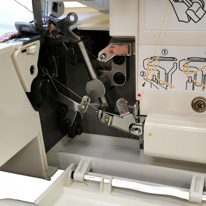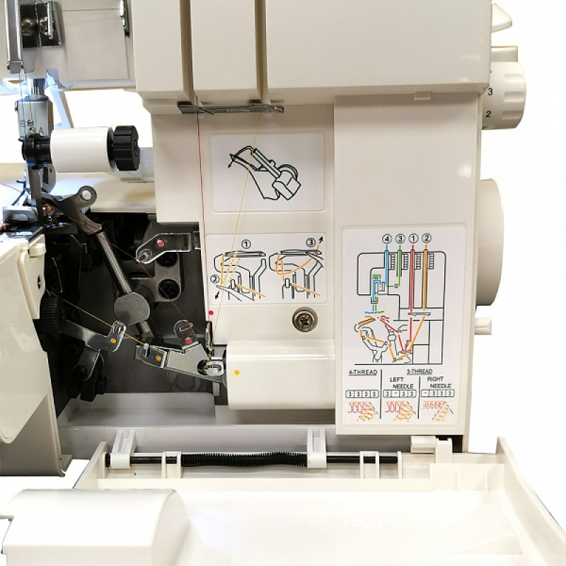 В оверлоке открытый доступ к заправке нити в нижний петлитель. Цветная схема последовательной заправки нитей в оверлок расположена под откидной крышкой петлителей, а подсказки с изображением шва и рекомендуемыми настройками нанесены на передней панели машины.