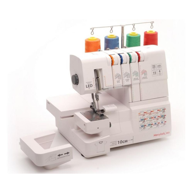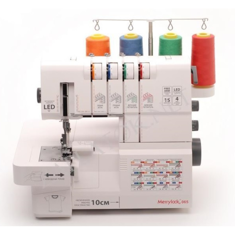 В комплекте идут приставной контейнер для обрезков и отсек под принадлежности оверлока. Имеется светодиодная подсветка над рабочим пространством. Для наглядности на корпусе меррилок 065 цветными пометками изображена заправка ниток. Все швы также нарисованы в отдельной картинке вместе с настройками к ним.