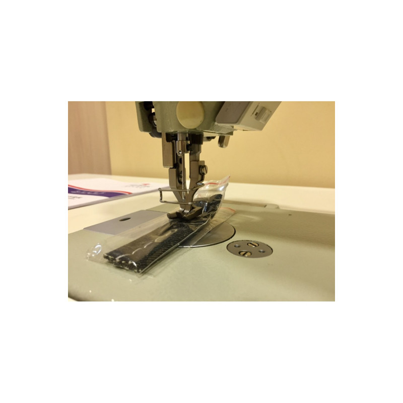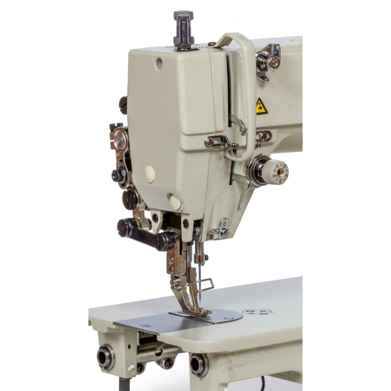 Прямострочная швейная машина с двойным продвижением материала имеет как нижнюю, так и верхнюю подачу ткани, что способствует беспосадочному шву. В машине установлены увеличенный челнок и игловодитель высокого качества, что улучшает качество работы при шитье на тяжёлых тканях. Длинный рукав значительно увеличивает рабочую поверхность. Длина стежка 8 или 12 мм (в зависимости от модификации машины).