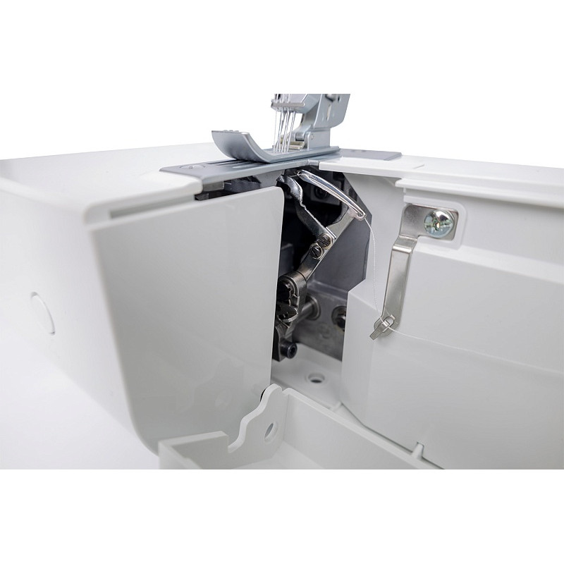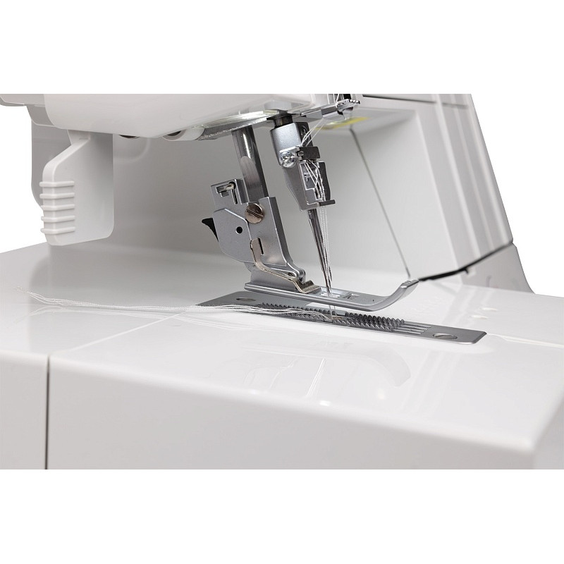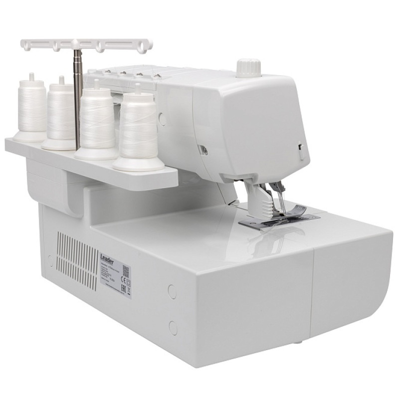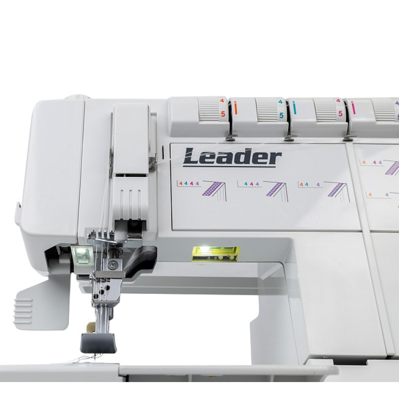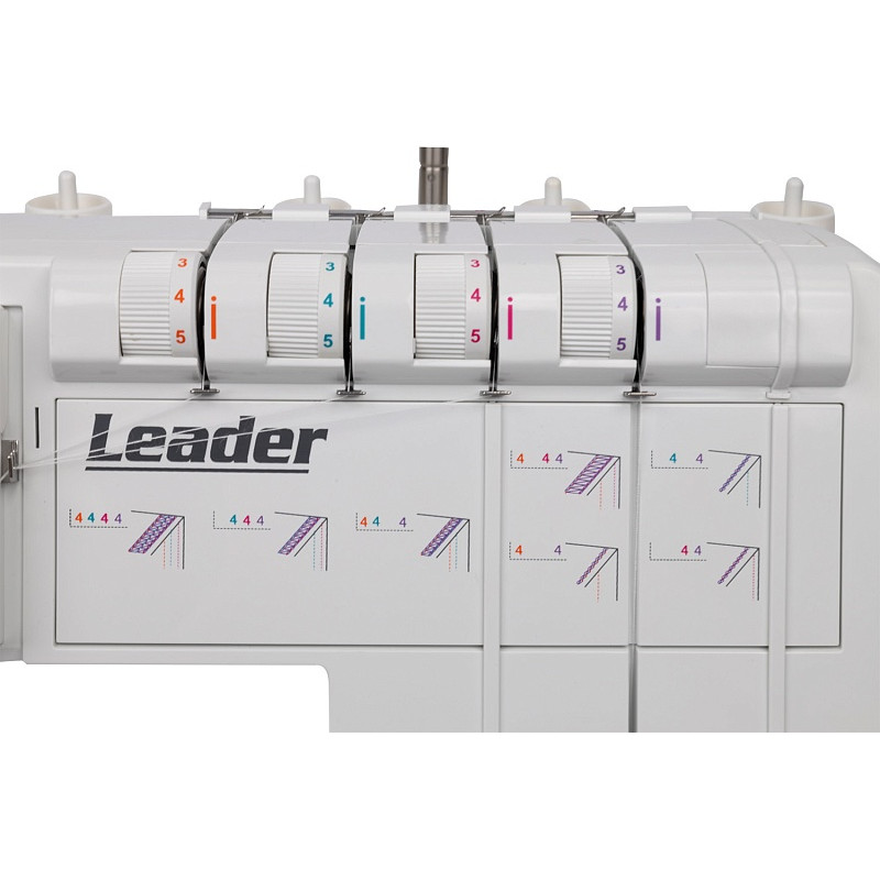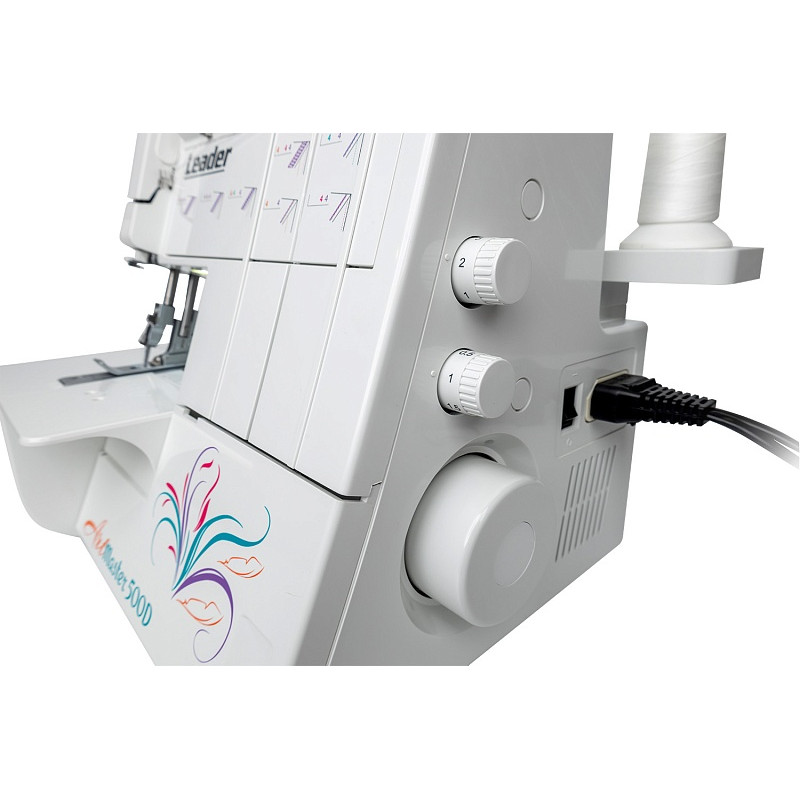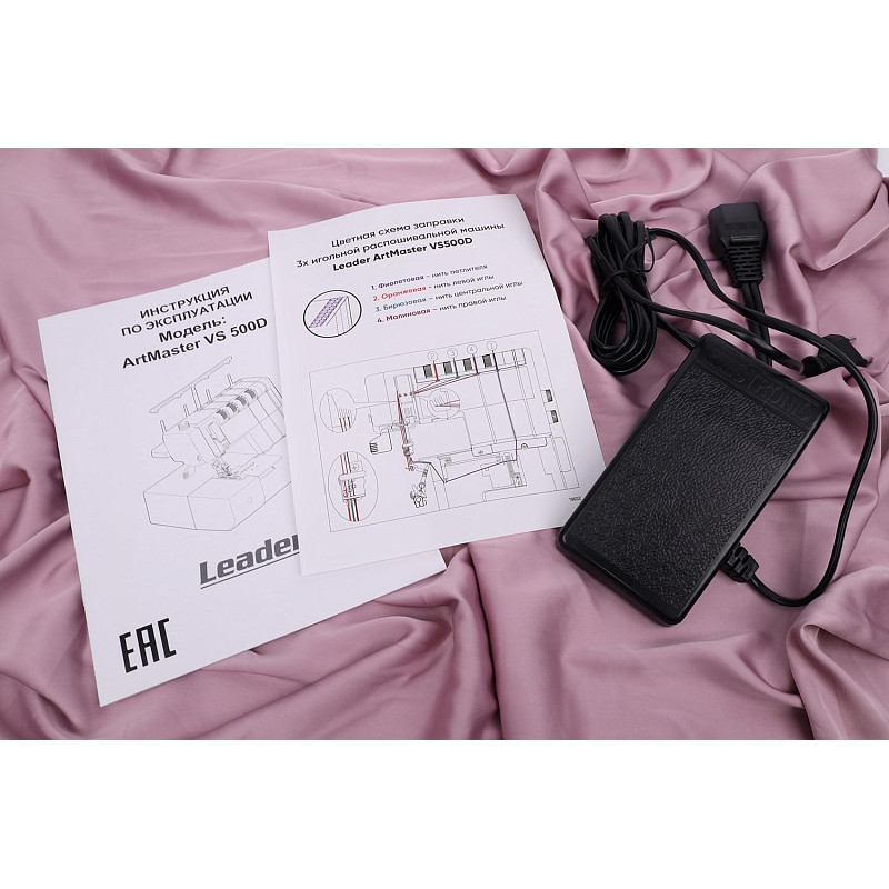 Leader ArtMaster VS 500D предназначена для обработки стрейч тканей и трикотажа, пошива нижнего белья, спортивной одежды, бальных платьев, для декоративной отделки изделий, пришивания резинки и шлёвок. Комфортная работа с удобным вспомогательным механизмом заправки нити в петлитель. Под откидной крышкой отсека петлителя расположена цветная и подробная схема заправки всех нитей. На передней панели машины отображены цветные схемы-подсказки с рекомендованными настройками натяжения каждой нити. Важно знать, что на формирование и качество шва влияет четкое соблюдение последовательности заправки нитей. От поломки машины предусмотрена защита (система блокировки): при открытой крышке отсека петлителей или при поднятой лапке срабатывает автоблокировка машины. Мощный, надёжный двигатель в 120 Вт позволяет обрабатывать ткань с высокой скоростью шитья до 1200 ст./мин. Регулятор дифференциальной подачи ткани и регулятор давления лапки на ткань позволяют работать со всеми видами стрейч-тканей и джинсой. Регулировка дифференциальной подачи ткани необходима при растяжении или сжатии материала. Длина стежка регулируется в интервале от 0,5 до 4 мм. Дифференциальная подача ткани от 0,5 до 2.0. Для быстрой заправки нити в иглу предусмотрен вспомогательный нитевдеватель, есть и иглодержатель, который необходим при смене игл. В распошивальной машине используются иглы типа EL x 705. С дополнительной яркой LED подсветкой обеспечена комфортная работа в любых условиях внешнего освещения. Удобно использовать встроенный нитеобрезатель, который предназначен для обрезки нитей в конце шва. На рабочей поверхности столика имеется размерная линейка - её используют в качестве направляющей. В комплектацию входит дополнительная прозрачная лапка с направителями, помогающими формировать швы. Необходимые в работе аксессуары хранятся в прозрачном пластиковом пенале.