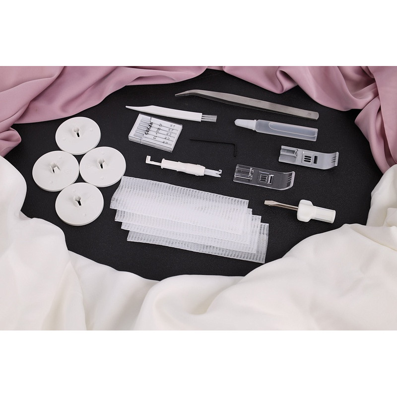 | Комплектация | Вспомогательный нитевдеватель /илодержатель Универсальная лапка Дополнительная прозрачная лапка с направителями Отвёртка Маслёнка Пинцет Щёточка от пыли Набор игл ELx705 Держатель катушки - 4 шт. Сеточка для катушек - 4 шт. Шестигранная отвёртка для смены игл Пенал для хранения аксессуаров Педаль Инструкция на русском языке |