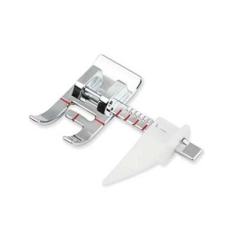 Лапка используется для шитья с отступом от края ткани до 27 мм, а также для выполнения параллельных строчек. Направитель позволяет регулировать и задавать расстояние между строчками.