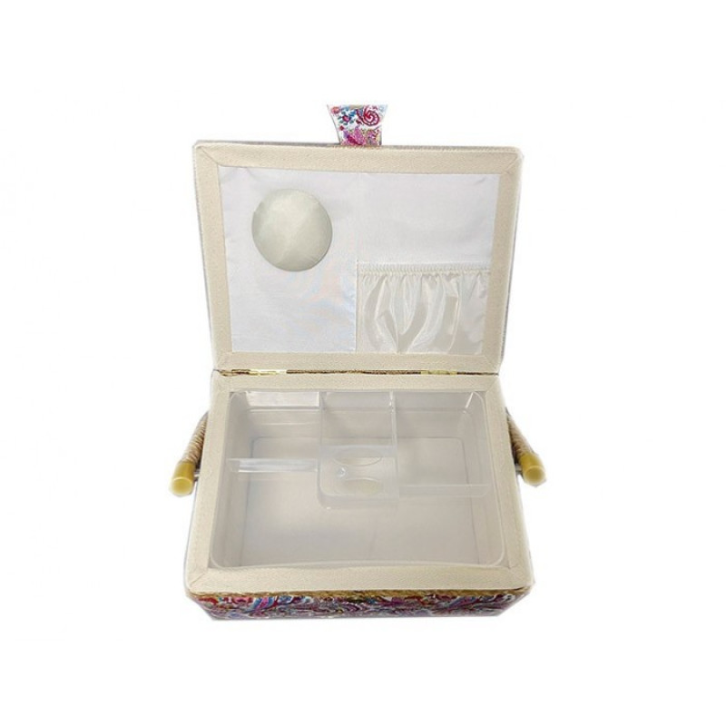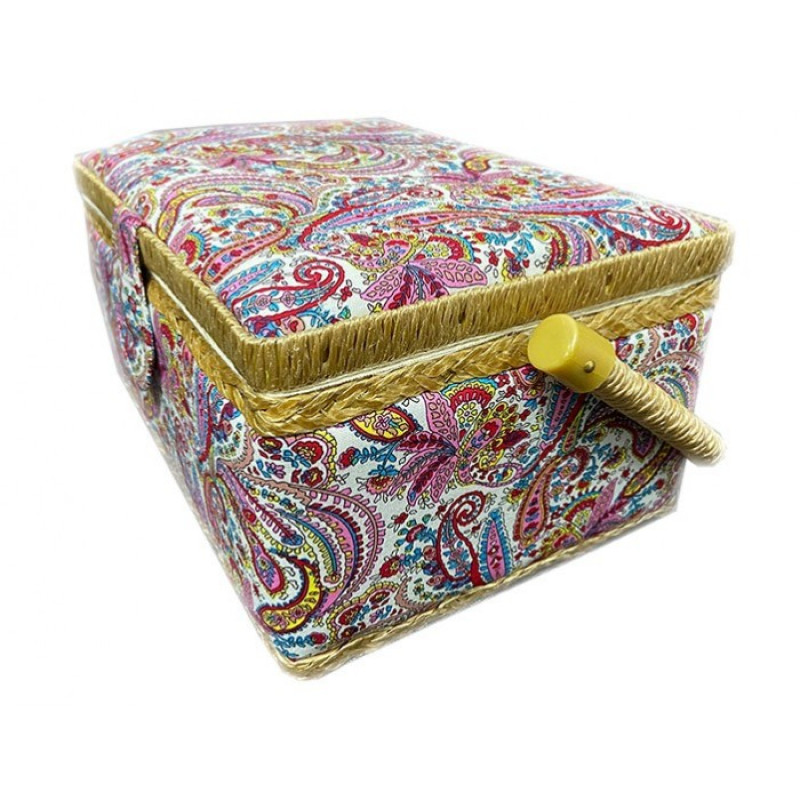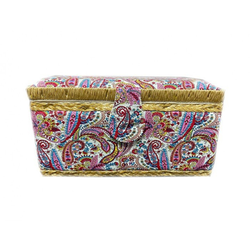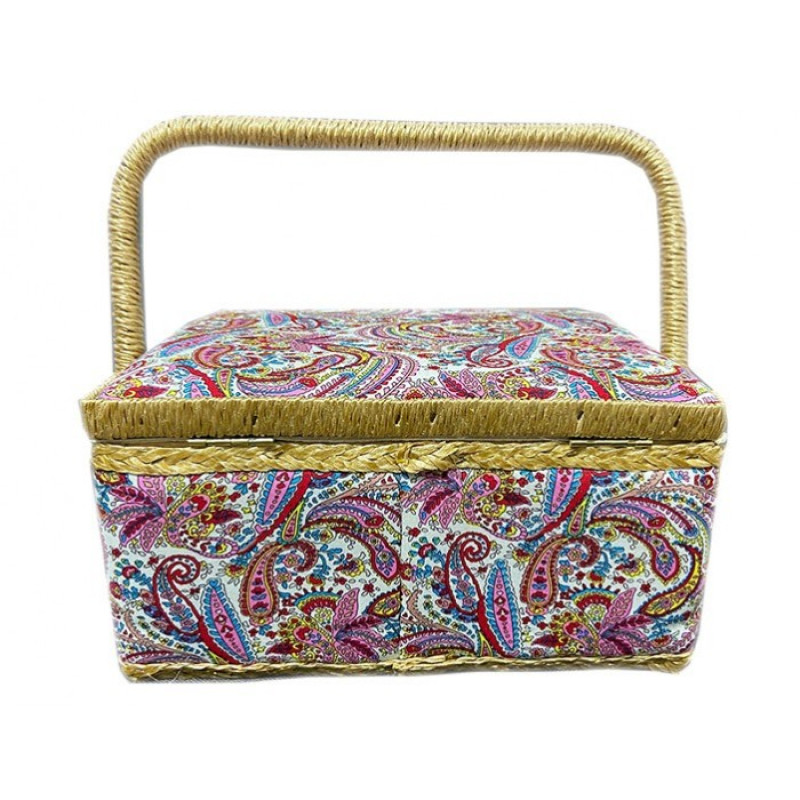 Шкатулка для рукоделия NWB-O-R-24.17.13 имеет текстильную обтяжку красивого цвета с принтом «турецкий огурец», удобную ручку для переноски, плетённые элементы по периметру крышки. Внутри шкатулки находится пластиковая вставка для хранения мелких элементов, вместительный основной отдел подойдет для хранения нитей, пуговиц и швейных принадлежностей, подушечка – для хранения игл. Шкатулку по достоинству оценит любая рукодельница. Закрывается шкатулка на магнитную кнопку.