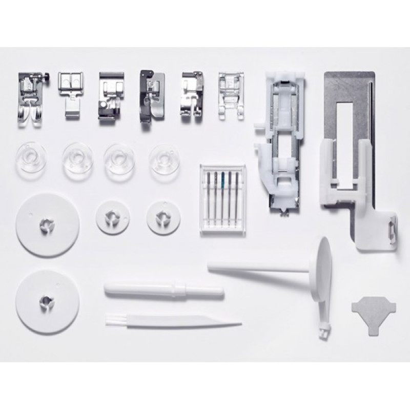 | Комплектация с завода | Универсальная лапка A Лапка для втачивания молнии Е Рамка для автоматического выполнения петли R Стабилизационная пластина Оверлочная лапка С Лапка для атласных строчек F Лапка для отстрочки в край 6мм O Лапка для потайного шва G Шпульки Набор игл Organ Вспарыватель Отвертка Щёточка от пыли Фетровая прокладка Дополнительный катушечный стержень Ограничитель для катушек малый Ограничитель для катушек большой Расширительный столик Жёсткий чехол |