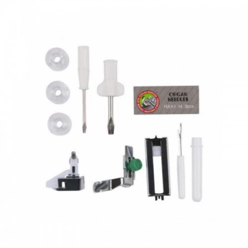 Помимо этого, машине типичны следующие функции – механизм отключения зубчатой (нижней) рейки, автоматизированный ниткообрезатель, рычаг обратного хода (реверс), регулировщик натяжения верхней нити и др. Швейная машина Elna 2100 укомплектована стандартными принадлежностями – это виниловый чехол, малая и большая отвертки, набор игл, вспарыватель, рамка для петли, универсальная лапка, пластиковые шпульки.