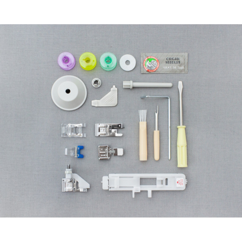 | Комплектация с завода | Педаль Шнур Мягкий чехол Расширительный столик Универсальная лапка Лапка для молнии Лапка прозрачная для атласных строчек Оверлочная лапка Лапка для невидимой подгибки Лапка для пришивания пуговиц Лапка для автоматической петли Линейка-направитель Отвертка большая Отвертка малая Шпульки Набор игл Распарыватель с кисточкой Дополнительный стержень для катушки Ограничители для катушки Фетровая прокладка под катушку |