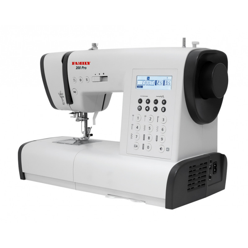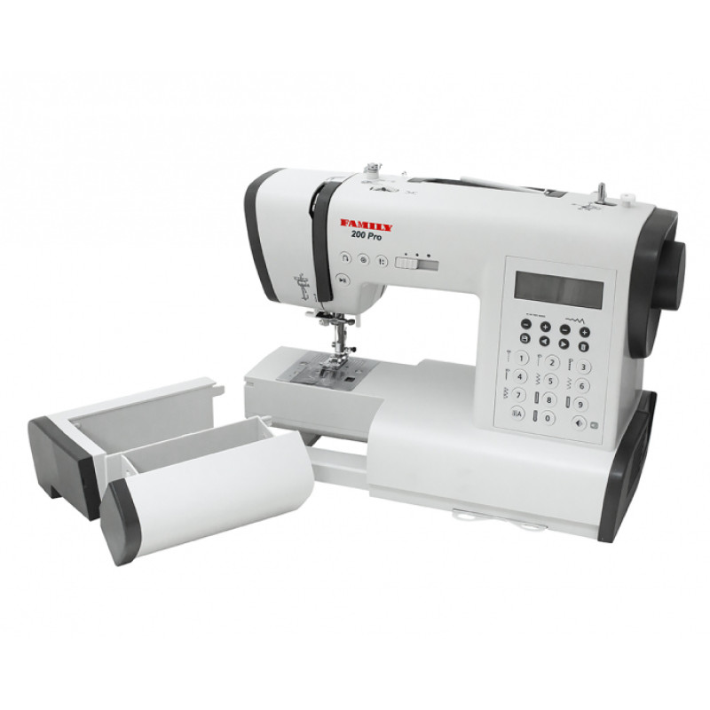 Family 200 Pro - компьютерная швейная машина, которая выполняет 100 операций. В Family 200 Pro есть регулятор давления лапки на ткань, благодаря которому можно работать с любыми типами ткани, даже самыми тонкими.