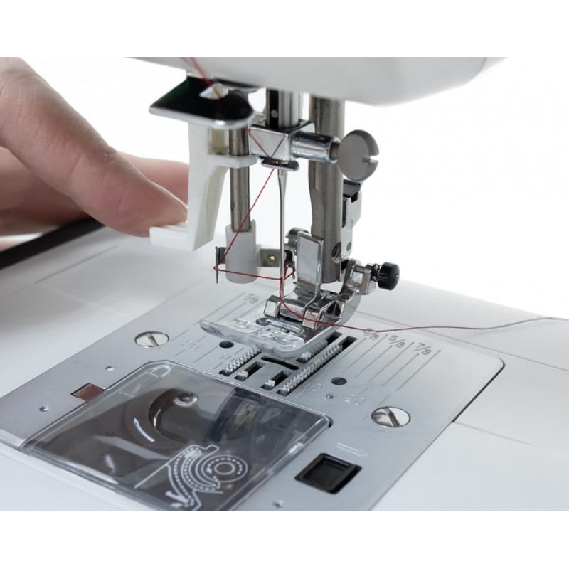 Встроенный заправщик нити в Family 200 Pro облегчит вам трудоемкий процесс. Просто возьмитесь за кончик нити, а нитевдеватель сам протянет ее через ушко иглы. В этой машине применен горизонтальный челнок, который не требует смазки. Преимуществом этого типа является меньшее количество вибраций при шитье, в нем значительно реже запутывается нить, а заправить машину будет намного проще. Прозрачная крышка позволяет следить за количеством нити на шпульке.
