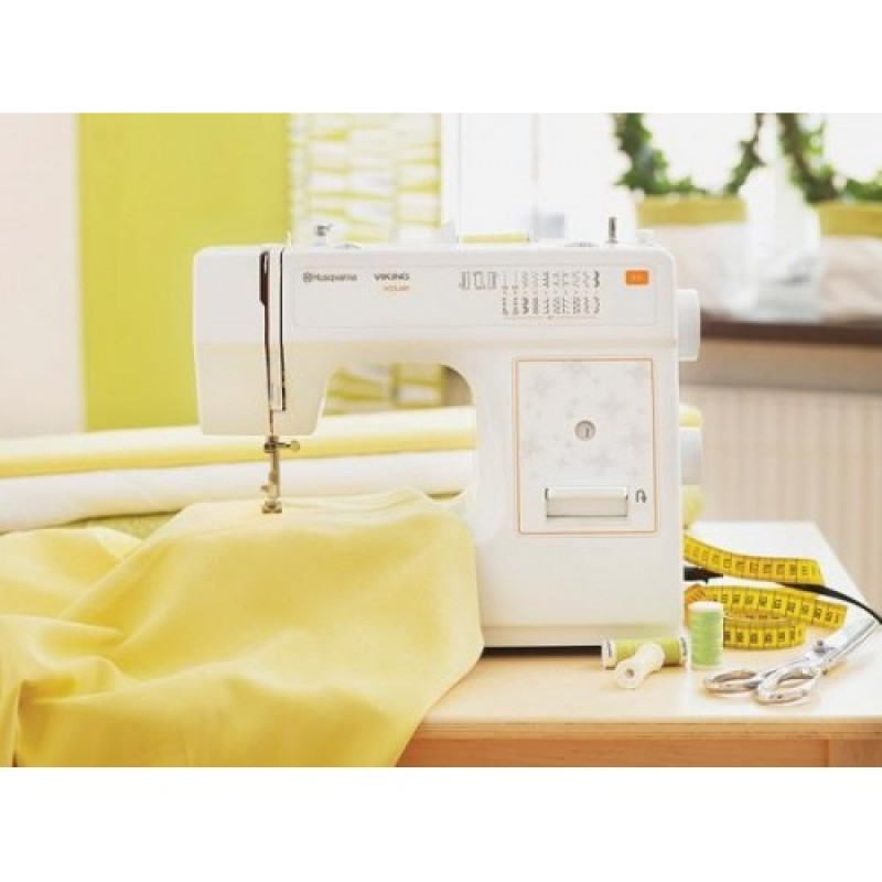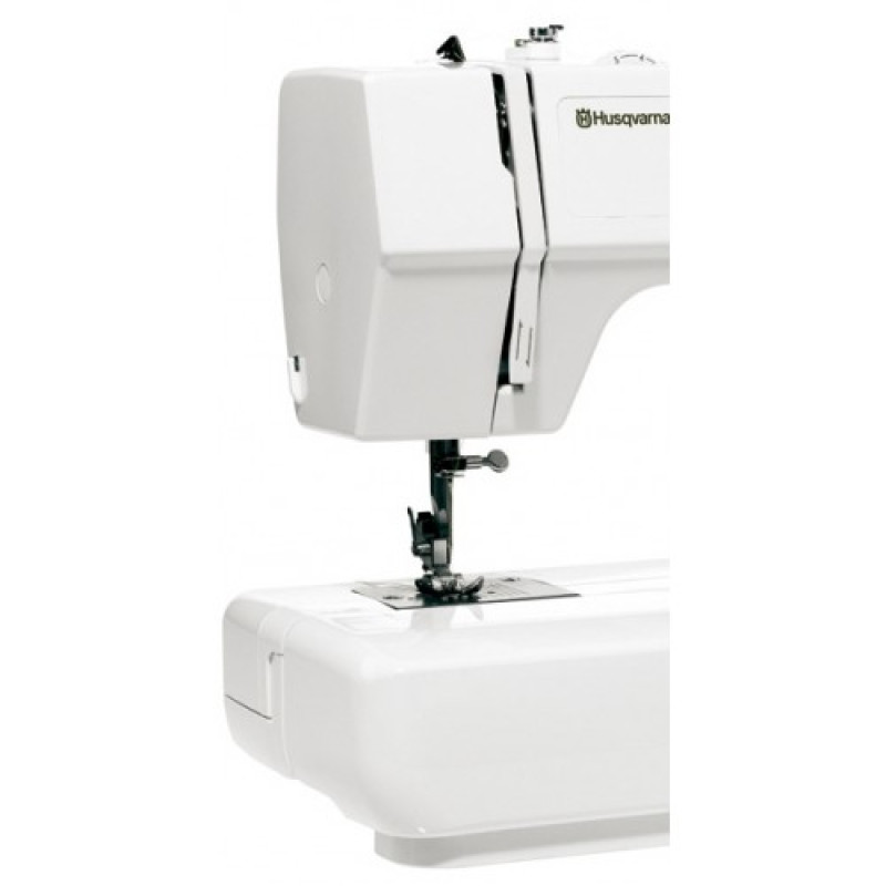 Натяжение нижней нити не регулируется. Скорость шитья определяется нажатием на ножную педалью. Сильнее прижали – быстрее шьем. Husquarna Viking E10 шьет тихо. Она довольно компактна - весит всего до 7 килограммов.