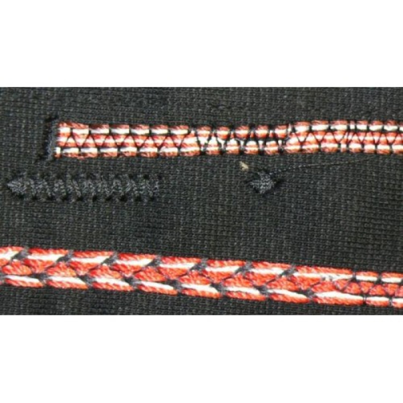 Строчка ложится ровно даже при утолщении. Максимальная длина стежка – 4 мм, максимальная ширина– 5 мм. В удобном отсеке для аксессуаров - набор лапок, распарыватель/щеточка, набор игол, отвертка, шпульки, линейка-направитель, фиксаторы катушки, дополнительный катушкодержатель, фетровая накладка.