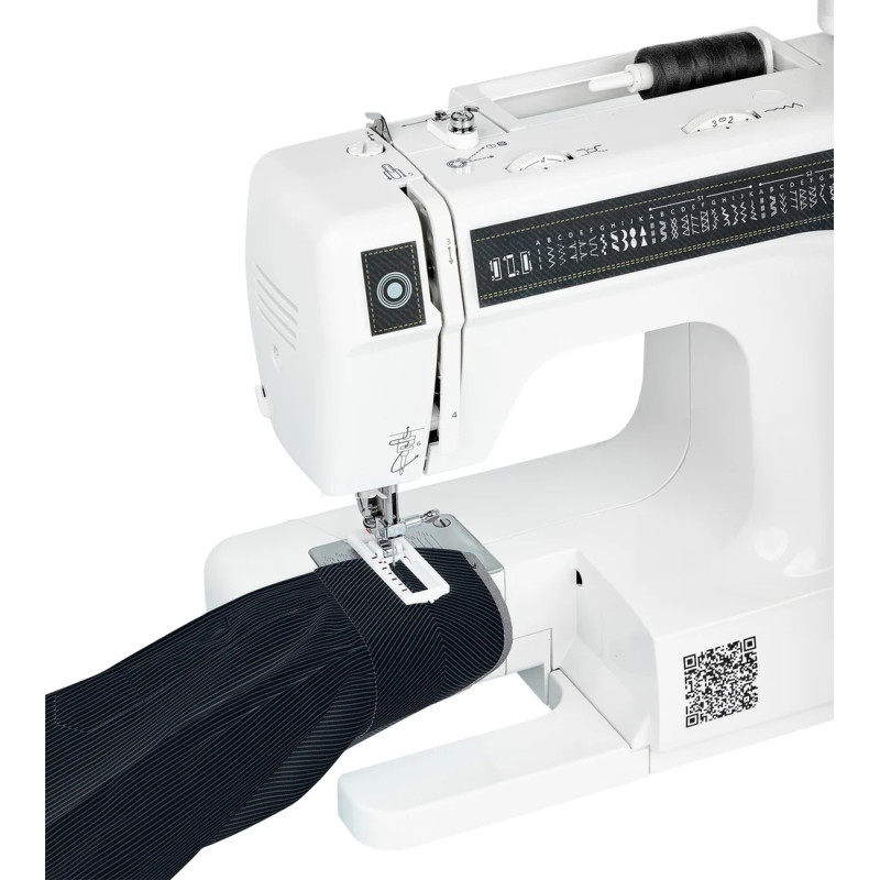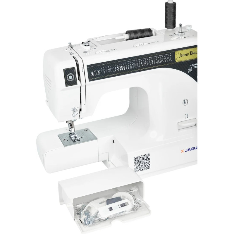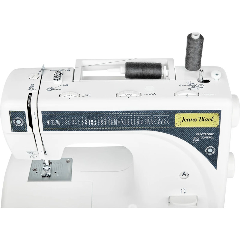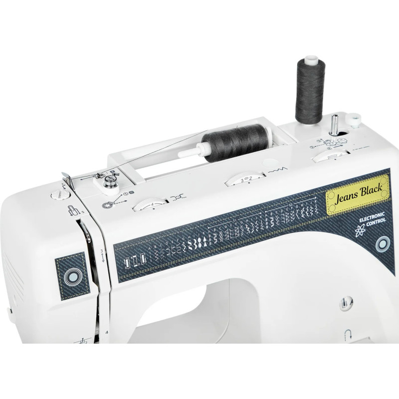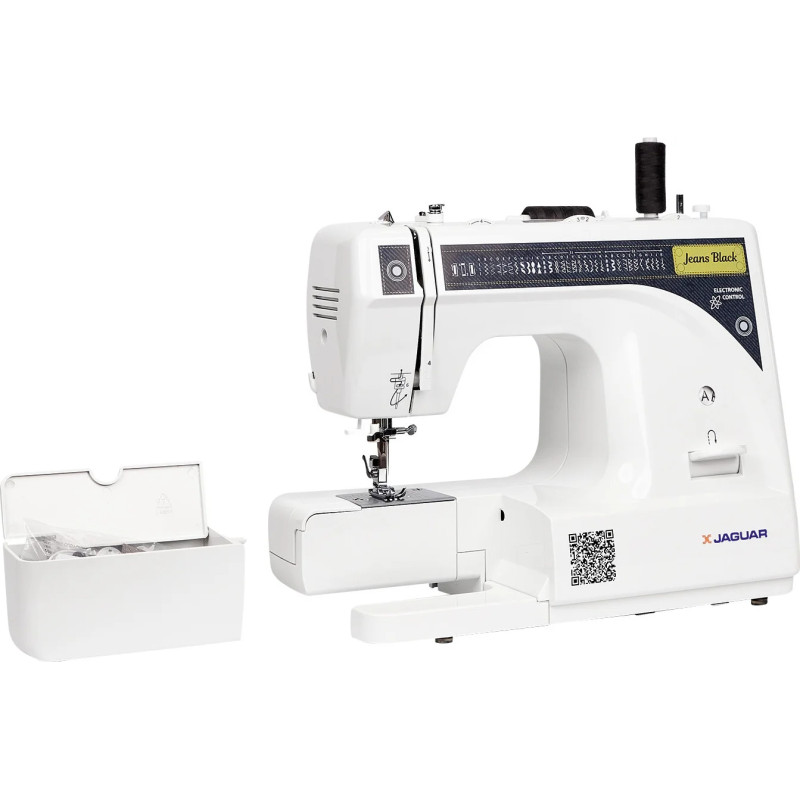 Мощная и элекгантная электромеханическая швейная машина Jaguar Jeans Black с вертикальным металлическим челноком сможет заменить вам любую другую швейную машину. Идеальным зигзагом можно аккуратно пришить резинку, предлагаются строчки и для любителей квилтинга. Петли для пуговиц вымётываются в полуавтоматическом режиме за 4 шага.