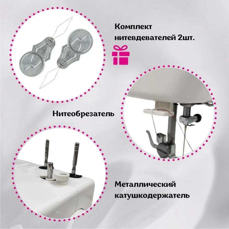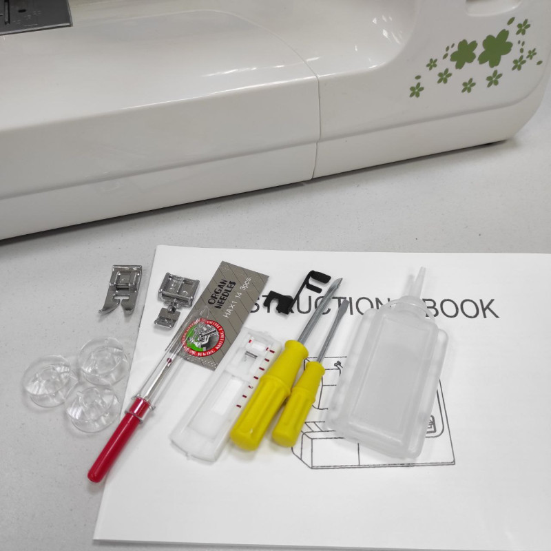 | Комплектация с завода | Шпульки прозрачные Вспарыватель Комплект игл Лапка для пуговичной петли Лапка для вшивания молнии Отвертки Масленка |