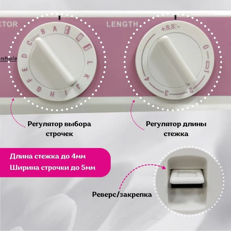| Виды строчек | Декоративные, Зиг-заг, Оверлочные, Потайные, Прямая, Эластичные |
