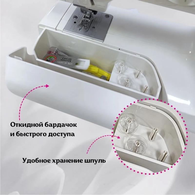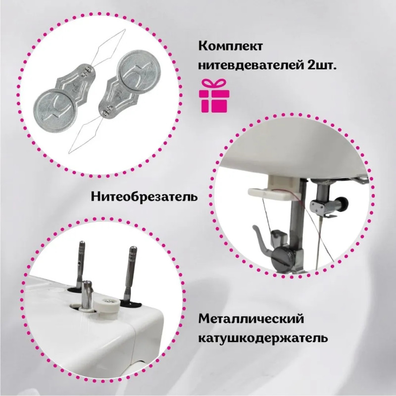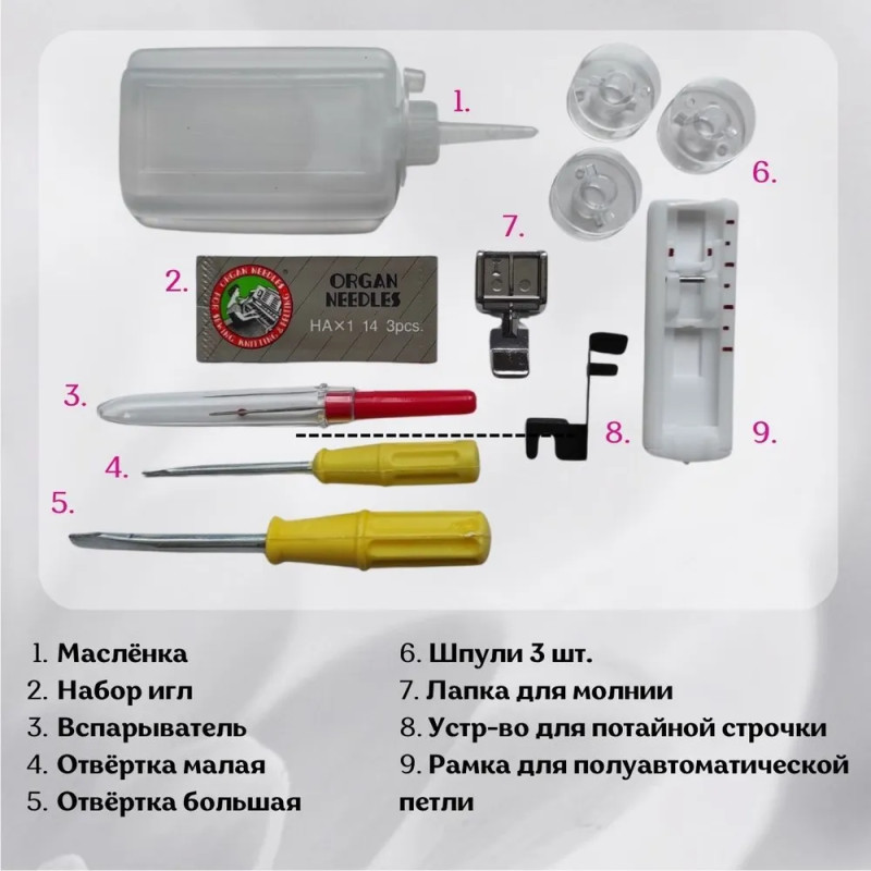 | Комплектация с завода | Шпульки прозрачные Вспарыватель Комплект игл Лапка для пуговичной петли Лапка для вшивания молнии Отвертки Масленка |