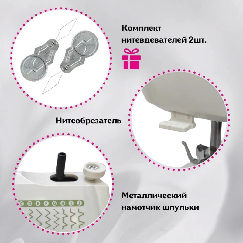 | Виды строчек | Декоративные, Зиг-заг, Оверлочные, Потайные, Прямая, Эластичные |