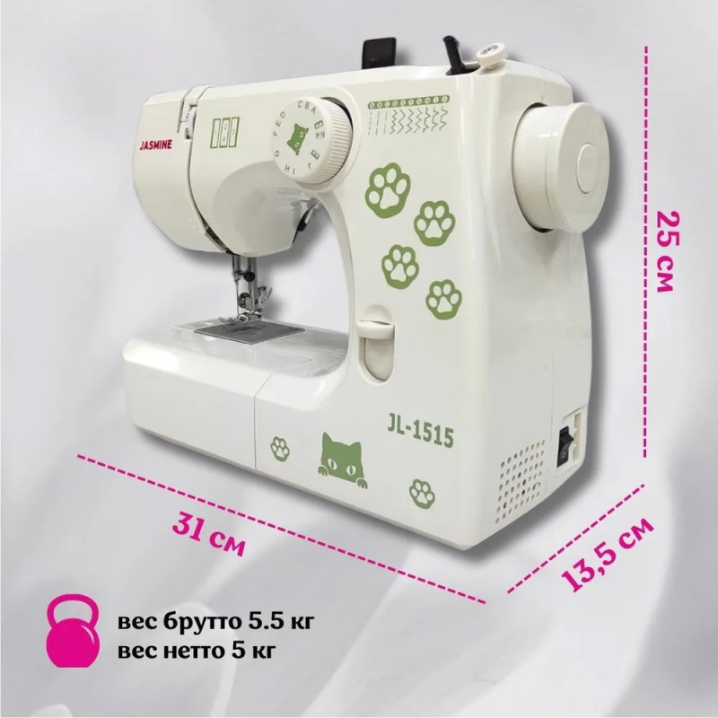 Jasmine JL-1515 — Jэлектромеханическая швейная машина, которая отлично подойдёт для новичка и для тех, кому нужна простая швейная машинка дома или дачи. Jasmine JL-112 выполняет 12 основных швейных операций, включая обметочные строчки, стежки для трикотажных тканей и петлю за 4 шага. Чтобы изменить длину строчки, прокрутите регулятор, который расположен наверху корпуса. Для шитья в обратном направлении, для штопки и закрепки предусмотрена клавиша реверс. Дополнительный подъём лапки позволит шить многослойные изделия. Узкие детали, детскую одежду можно обработать при помощи съёмного рукава. Jasmine JL-1515 станет надёжной помощницей в первых шагах шитья и рукоделия.