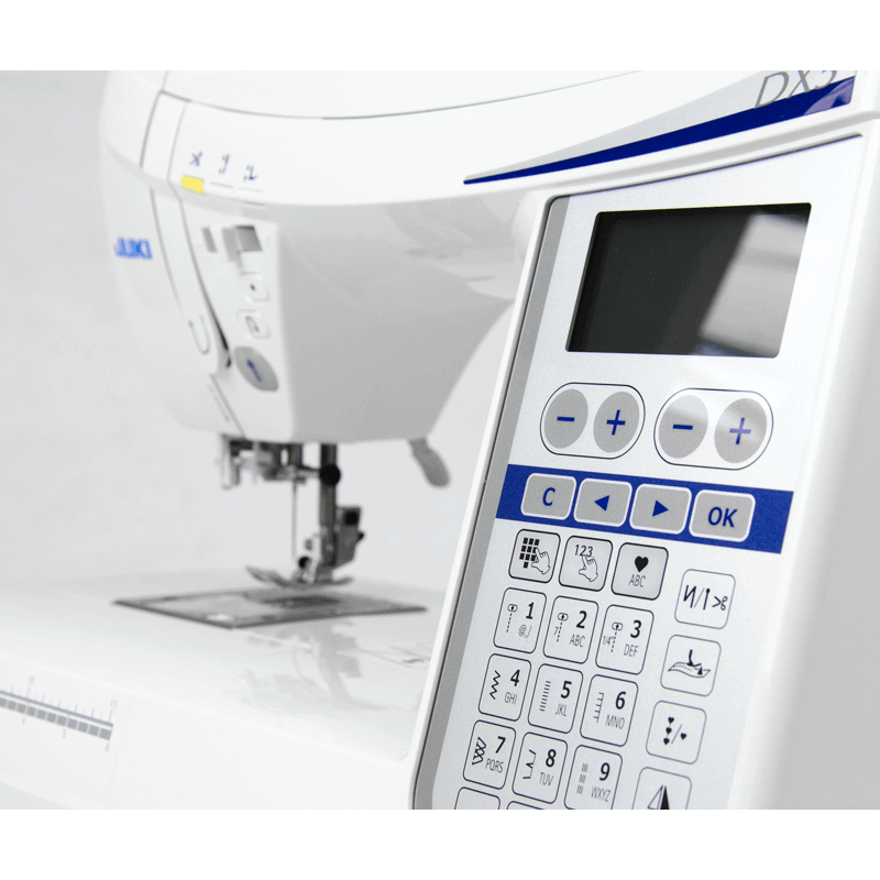 Представляем вашему вниманию новинку. Швейная машина Juki HZL-DX5 относится к классу современных компьютеризованных машин. Она отличается хорошей функциональностью и простым управлением. Мощность мотора машины позволяет работать с плотными тканями, в том числе с джинсовой тканью в несколько сложений. При этом благодаря плавной работе нижнего транспортёра даже очень деликатная ткань будет захватываться равномерно и двигаться без замятий.