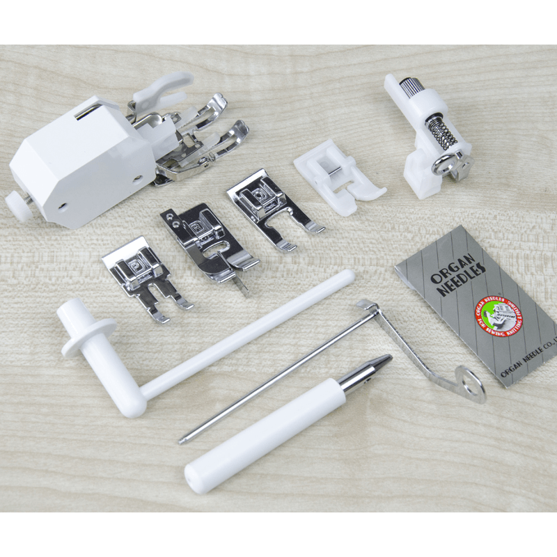 | Комплектация с завода | DVD; Двойная игла; Дополнительный столик; Иглы; Инструкция на русском языке; Катушкодержатель дополнительный; Колпачок катушки ; Отвёртка; Распарыватель; Чехол (жесткий); Шпульки; Щеточка для очистки Лапки в комплекте: Лапка двухсторонняя для вшивания молний, трубчатой тесьмы и шитья по краю; Лапка для атласных строчек; Лапка для канта; Лапка для молнии; Лапка для потайного шва; Лапка для пэчворка и квилтинга; Лапка для пришивания аппликаций; Лапка для создания петель; Лапка-верхний транспортер; Лапка тефлоновая; Лапка для сатиновых строчек |