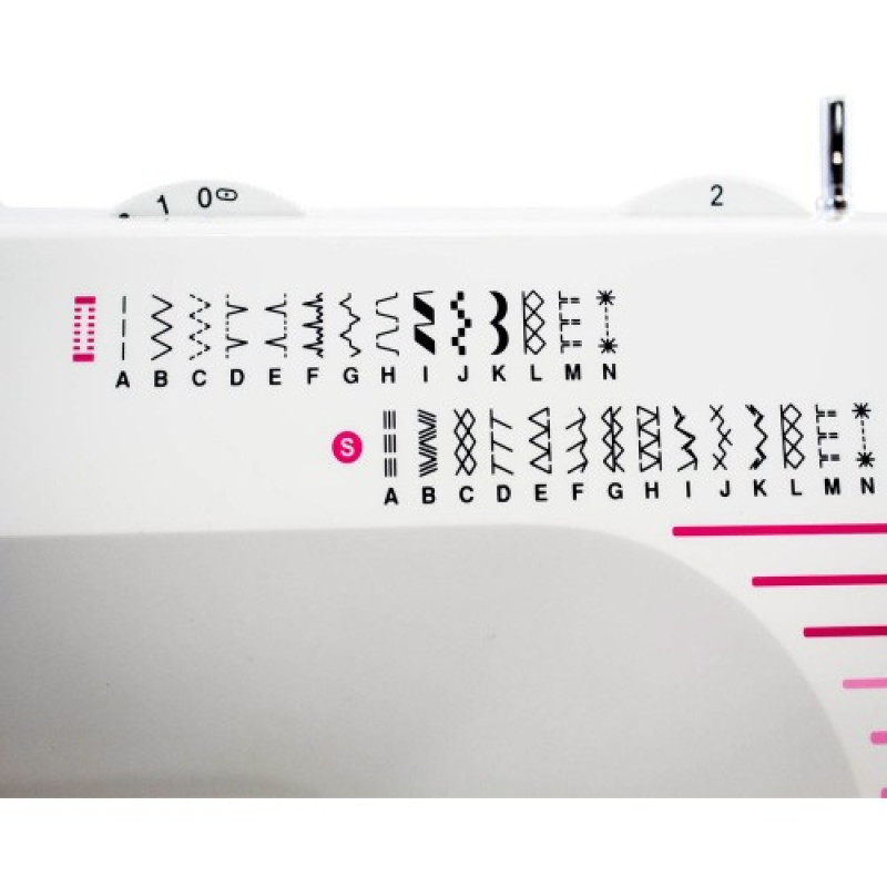 Регулировка длины стежка осуществляется максимально плавно. Внутри встроен автоматический нитевдеватель. Функция намотки шпульки может осуществляться в стандартном автоматическом режиме. Скорость шитья может регулироваться при помощи предназначенной для этой цели педали. При работе могут формироваться строчки следующего типа: зигзаг, прямая, тройная прямая, автоматическая петля, эластичная строчка, оверлочная и декоративная строчка.