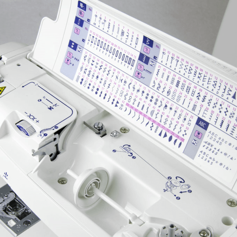 Модель с горизонтальным типом челнока имеет увеличенную рабочую область (21 см вправо от иглы), а также удобный нитевдеватель и возможность подключения коленоподъемника (покупается отдельно). На корпусе есть дисплей и сенсорный блок для управления всеми настройками стежков. Среди 155 операций можно выбрать 15 вариантов прорезной петли и символы трех алфавитов. Машина выполняет автозакрепку и автообрезку нити, есть регулировка скорости и положения иглы, а также включение строчки кнопкой (без педали). Силу давления лапки можно задать вручную.