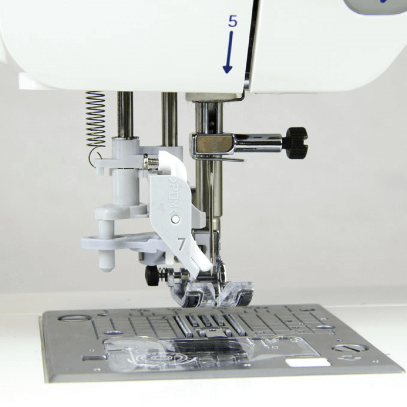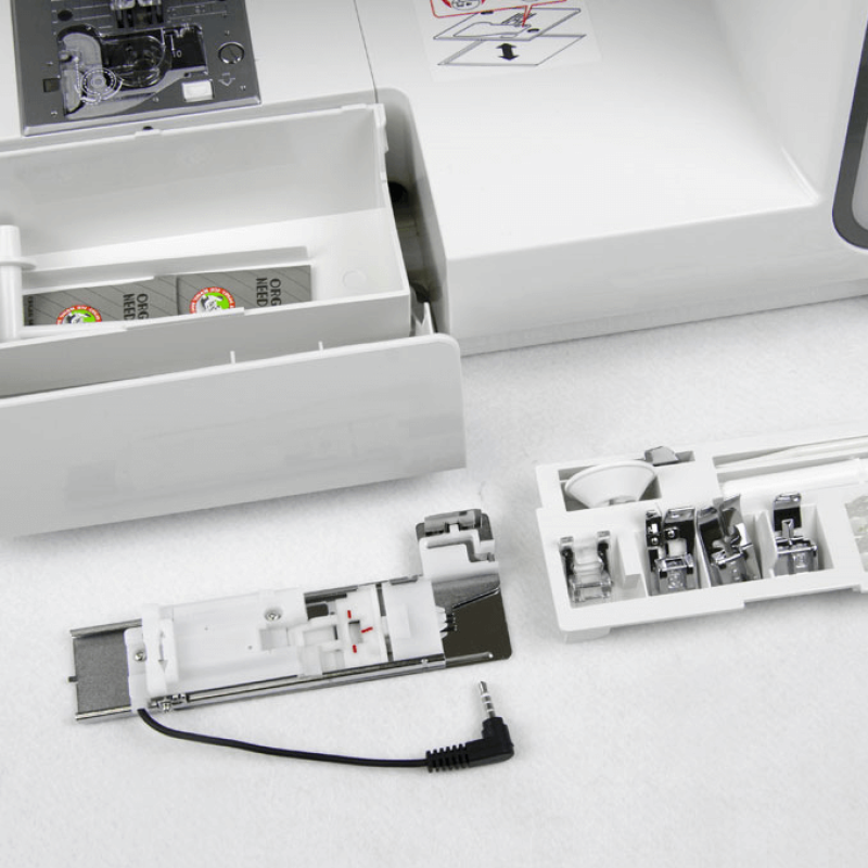 Модель комплектуется программируемой педалью и жестким защитным футляром, необходимыми прижимными лапками.