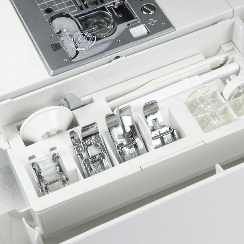 | Комплектация с завода | Лапка универсальная. Лапка для автоматической петли. Лапка оверлочная. Лапка для молнии. Лапка для потайного шва. Лапка для вышивания пуговичных петель. Отвертка. Набор игл. Шпульки. Колпачки для катушек. Вспарыватель. Щеточка. Дополнительный катушкодержатель. Двойная игла. Жесткий чехол. Педаль. Инструкция |