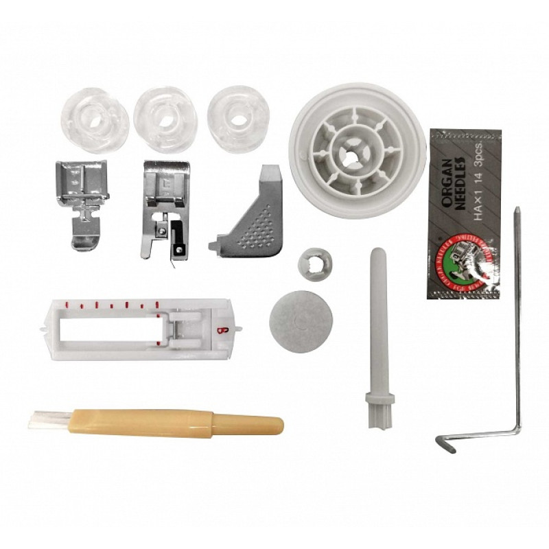 | Комплектация с завода | Лапка универсальная. Лапка для вшивания молнии. Лапка для пуговичных петель. Оверлочная лапка. Направитель для квилтинга. Набор игл 3 шт. Шпульки 4 шт. Держатель катушки большой и малый. Плоская отвертка. Дополнительный катушечный стержень (вертикальный). Вспарыватель/щёточка. Фетровая прокладка. Мягкий чехол. Педаль. Инструкция на русском языке. |