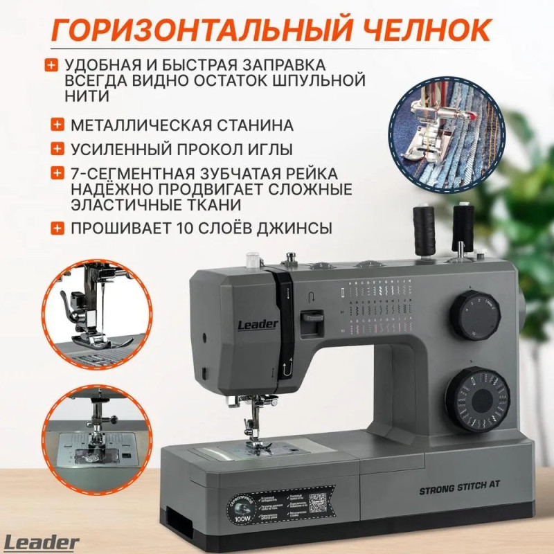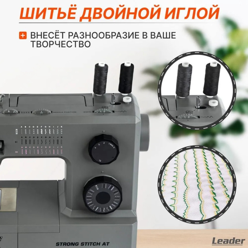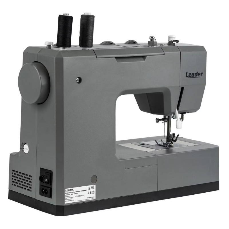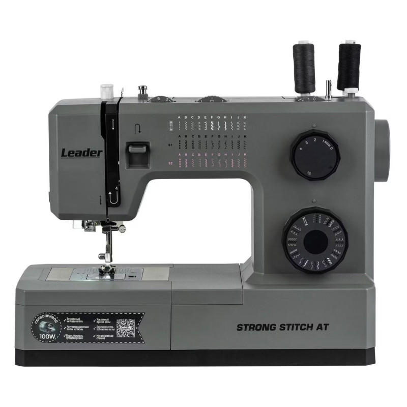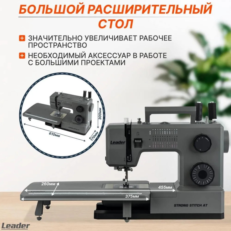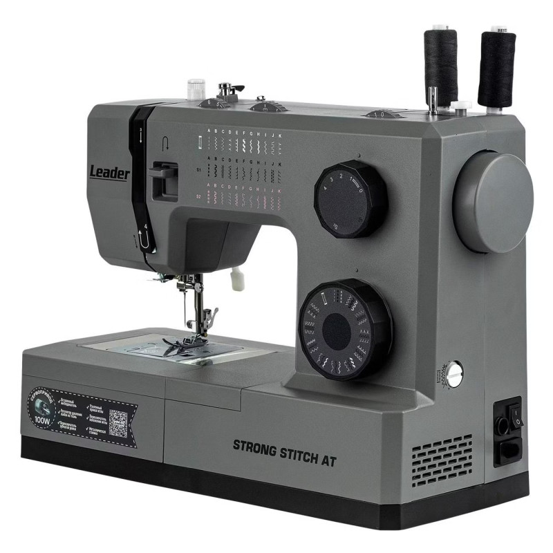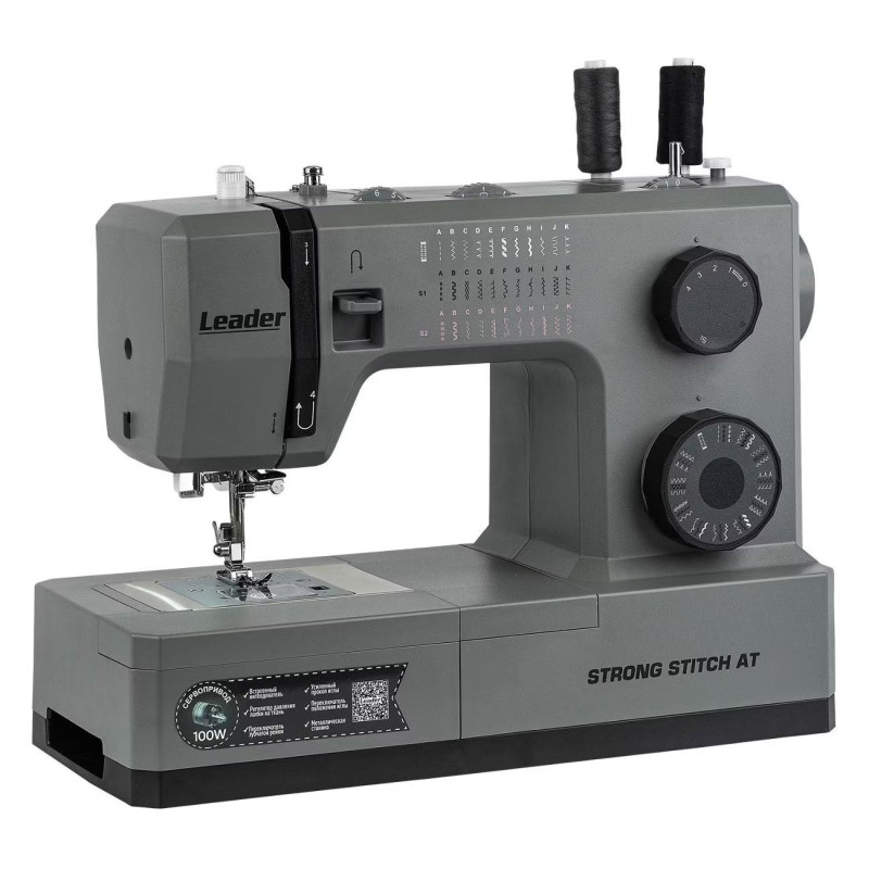 Leader STRONG STITCH AT — мощная электромеханическая швейная машина с большим расширительным столиком, с металлической станиной, регулятором давления лапки на ткань, регулятором баланса петли, рычагом переключения зубчатой рейки нижнего транспортёра. Регулятор положения иглы удобно использовать при создания строчки по краю ткани с левым или правым положением иглы. Надёжная, мощная с цельнометаллическим каркасом, с лёгкой и быстрой заправкой горизонтального челнока – всегда удобно отслеживать остаток шпульной нити. С помощью встроенного нитевдевателя нить быстро попадает в ушко иглы. Мощный 100 Вт встроенный серводвигатель позволяет шить сложные и тяжёлые ткани с максимальной скоростью шитья 850 об./мин. 7-сегментная зубчатая рейка уверенно продвигает лёгкие и различные сложные ткани. Машина Leader STRONG STITCH AT для профессионального шитья! В работе с объёмными проектами и пошиве верхней одежды предлагается установить большой расширительный столик с нанесённой линейной разметкой. На свободном рукаве удобно шить изделия по кругу, такие как брючины, манжеты, детскую одежду. В отсеке съёмного столика удобно хранить аксессуары. В комплектации есть лапка для пришивания пуговиц и пластина для трудных мест. Она компенсирует перепады толщины материала, позволяет прошивать толстые и сложные боковые швы, предотвращает пропуски стежков.