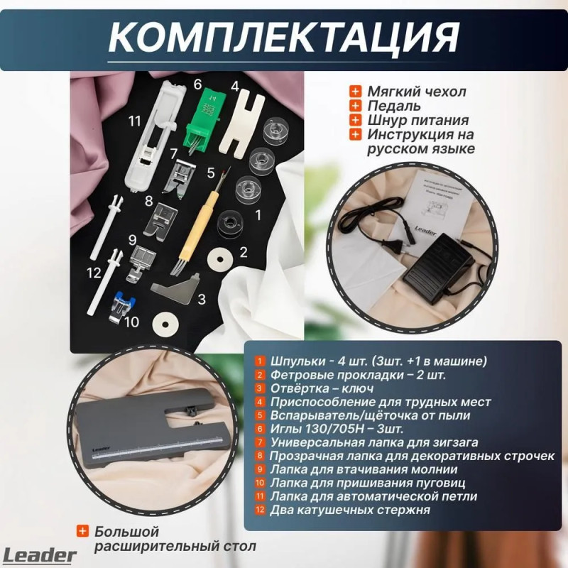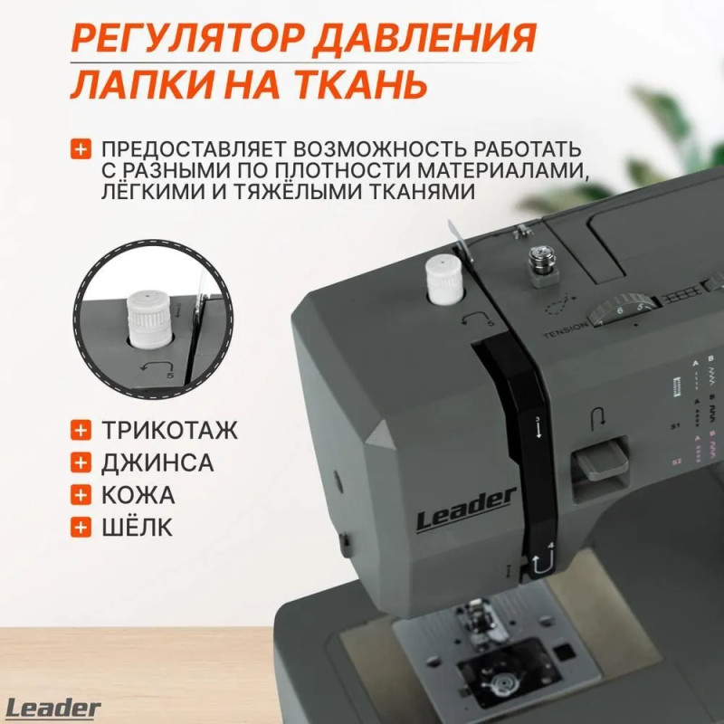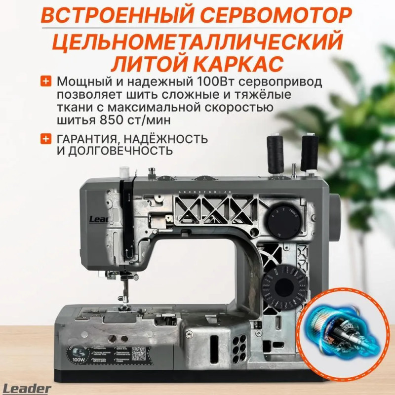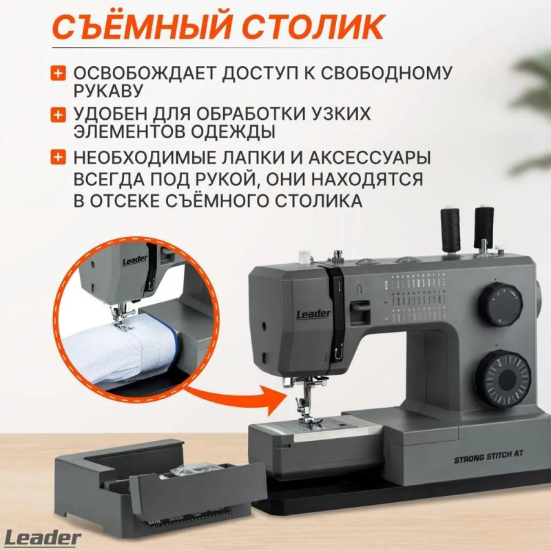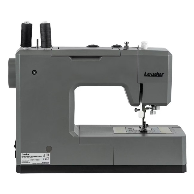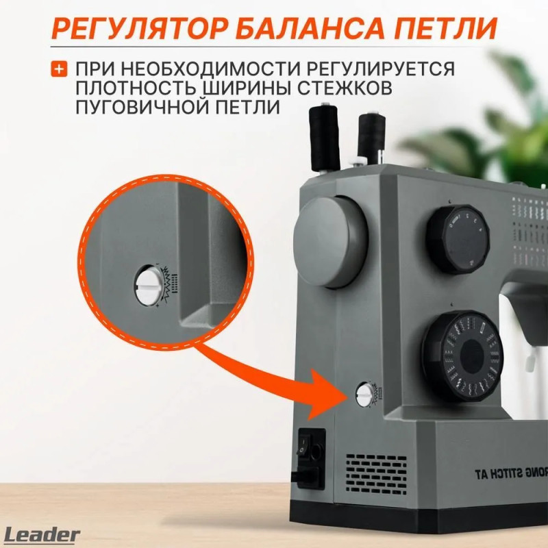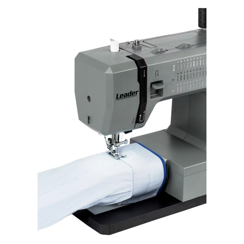 Leader STRONG STITCH AT — мощная электромеханическая швейная машина с большим расширительным столиком, с металлической станиной, регулятором давления лапки на ткань, регулятором баланса петли, рычагом переключения зубчатой рейки нижнего транспортёра. Регулятор положения иглы удобно использовать при создания строчки по краю ткани с левым или правым положением иглы. Надёжная, мощная с цельнометаллическим каркасом, с лёгкой и быстрой заправкой горизонтального челнока – всегда удобно отслеживать остаток шпульной нити. С помощью встроенного нитевдевателя нить быстро попадает в ушко иглы. Мощный 100 Вт встроенный серводвигатель позволяет шить сложные и тяжёлые ткани с максимальной скоростью шитья 850 об./мин. 7-сегментная зубчатая рейка уверенно продвигает лёгкие и различные сложные ткани. Машина Leader STRONG STITCH AT для профессионального шитья! В работе с объёмными проектами и пошиве верхней одежды предлагается установить большой расширительный столик с нанесённой линейной разметкой. На свободном рукаве удобно шить изделия по кругу, такие как брючины, манжеты, детскую одежду. В отсеке съёмного столика удобно хранить аксессуары. В комплектации есть лапка для пришивания пуговиц и пластина для трудных мест. Она компенсирует перепады толщины материала, позволяет прошивать толстые и сложные боковые швы, предотвращает пропуски стежков.