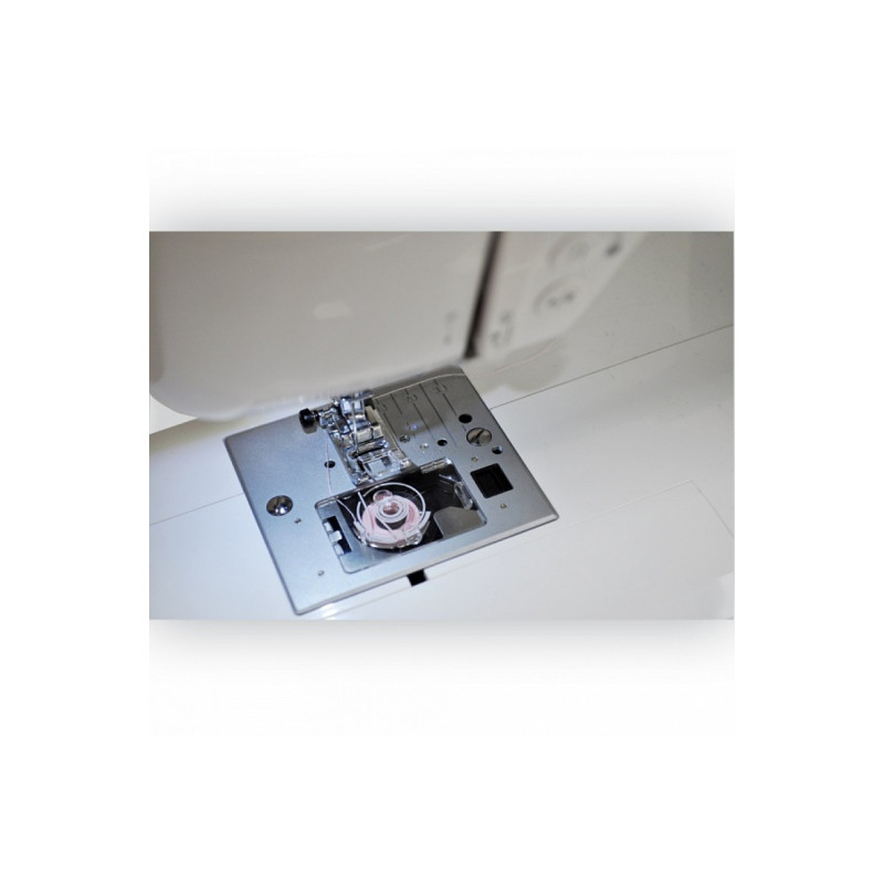 Модель имеет приставной столик, благодаря которому можно с удобством шить большие изделия. Отзывы покупателей упоминают удобную панель управления с экраном для настройки операций. Скорость шитья регулируется переключателем, здесь же расположена кнопка «Старт/стоп». Машина оборудована рукавной платформой и подсветкой. Для декоративной отстрочки можно установить двойную иглу.