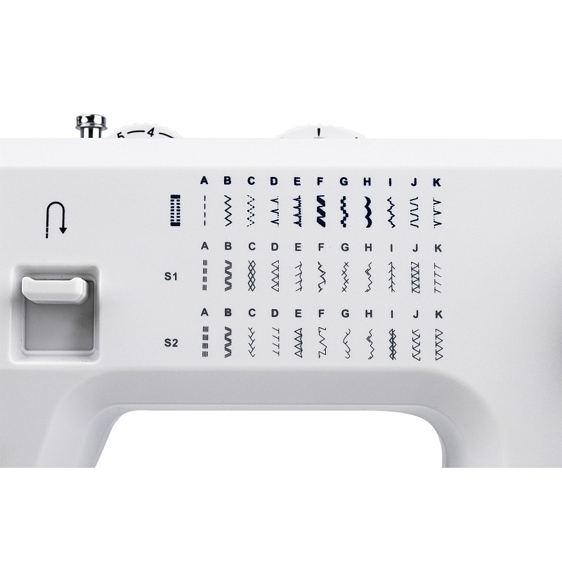 В машине 34 швейные операции, включая автоматическую петлю для пуговицы: рабочие, оверлочные, потайные, трикотажные, эластичные, декоративные, строчки для квилтинга. При желании можно изменить плотность ширины стежка пуговичной петли - регулятор расположен рядом с маховым колесом.