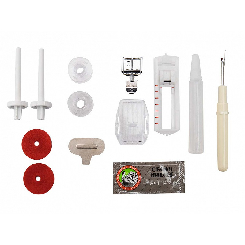 | Комплектация с завода | Лапка универсальная; Лапка для вшивания молнии двухсторонняя; Рамка для вымётывания петли; Штопальная пластина; Катушечный стержень (вертикальны); Фетровые прокладки; Вспарыватель/щёточка от пыли; Шпульки 2+1; Набор игл; Маслёнка; Педаль; Чехол мягкий; Инструкция на русском языке. |