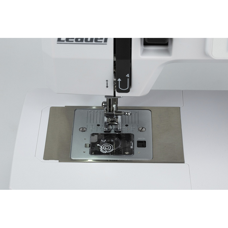 Новая швейная машина Leader HIGH POWER — это компьютерная (электронная) швейная машина. В Leader HIGH POWER установлен самый современный горизонтальный челнок: быстрая и удобная заправка шпульной нити, видно наличие нижней нити.