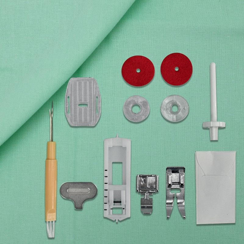 | Комплектация с завода | Лапка для втачивания молнии Лапка для выметывания петли Стрежни катушечные Пластина для штопки и вышивания Вспарыватель Шпульки Иглы Отвертка Мягкий чехол Инструкция на русском языке |