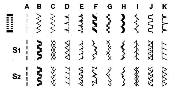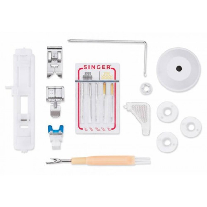 Машина поставляется с комплектом лапок: для автоматического пришивания пуговиц, для обметывания бельевых петель, для универсального применения, для вшивания молнии, можно шить двумя цветами ниток одновременно с помощью двойной иглы.