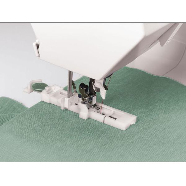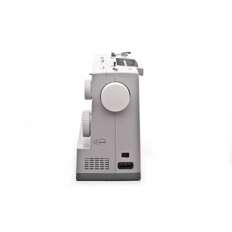 Машина плавно регулирует изменение размеров стежка, есть подсветка области шитья. Оснащена встроенным нитевдевателем, меняется усилие давления лапки на ткань, есть специальная платформа для удобной обработки воротника и рукавов, режим реверса и автоматическая намотка ниток на шпульку. Предусмотрен удобный отсек для хранения аксессуаров.