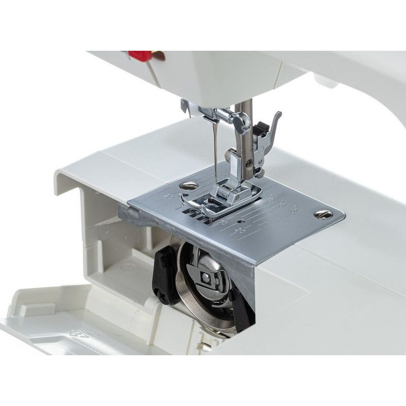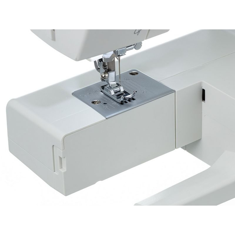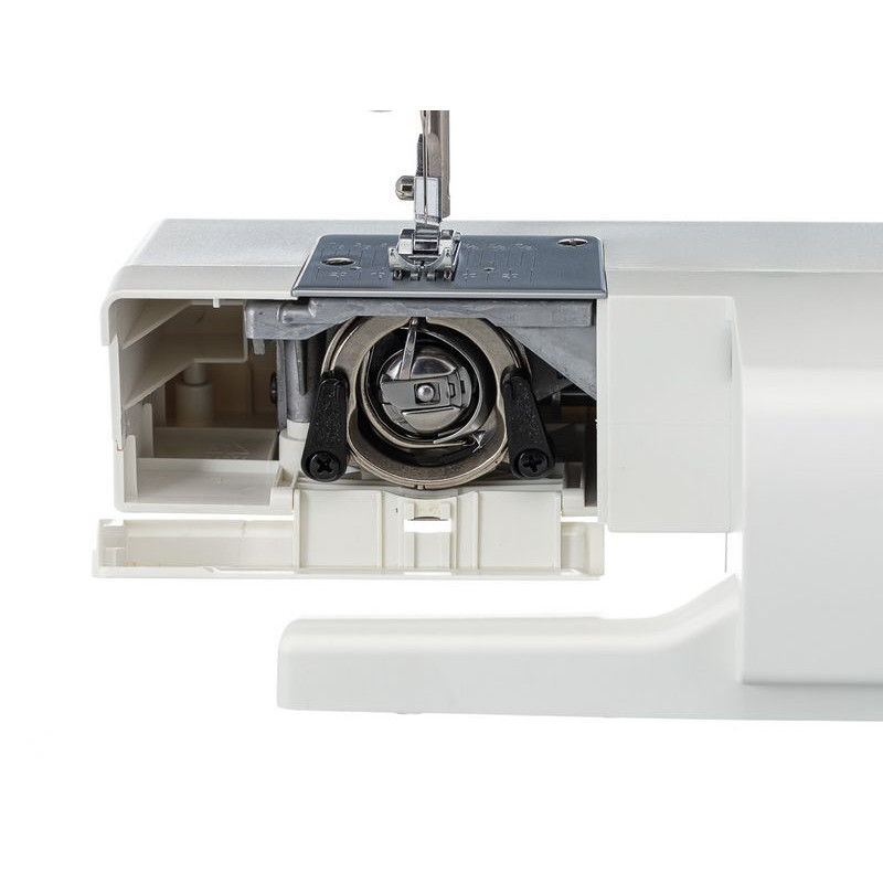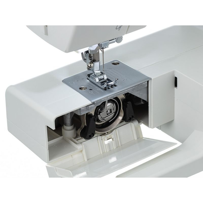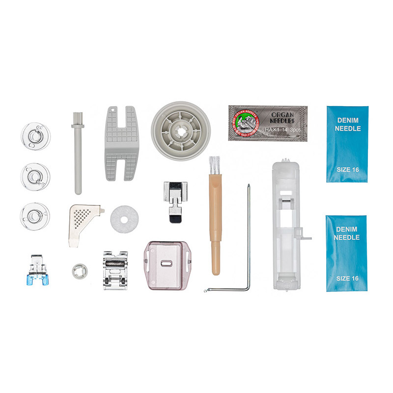 | Комплектация с завода | Универсальная лапка Лапка для автоматической петли Лапка для вшивания молнии Лапка для пришивания пуговиц Роликовая лапка Приспособление для трудных мест Штопальная пластина Направитель для квилтинга Шпульки Держатель катушки большой Держатель катушки малый Вертикальный катушечный стержень Фетровая прокладка Вспарыватель/щёточка для чистки пыли Набор игл Отвёртка-ключ Педаль |