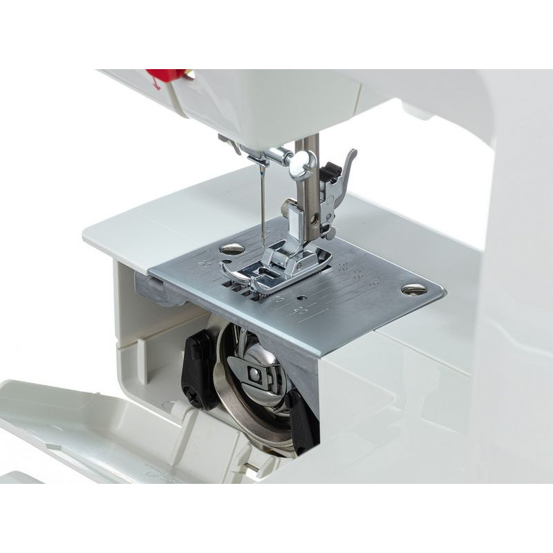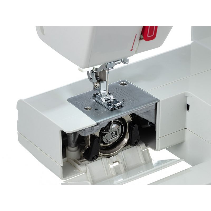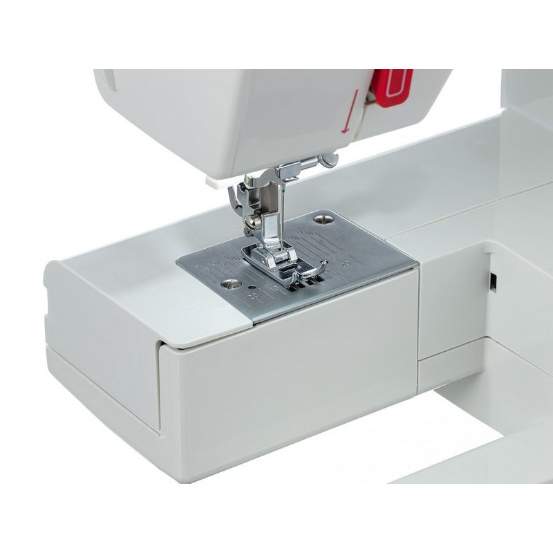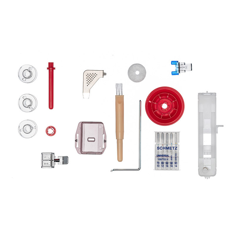 | Комплектация с завода | Универсальная лапка Лапка для автоматической петли Лапка для вшивания молнии Лапка для пришивания пуговиц Штопальная пластина Направитель для квилтинга Набор ниток и шпулек - по 32 шт. Держатель катушки большой Держатель катушки малый Вертикальный катушечный стержень Фетровая прокладка Вспарыватель/щёточка для чистки пыли Набор игл Отвёртка-ключ Педаль |