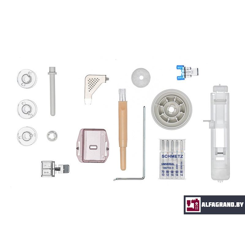 | Комплектация с завода | Универсальная лапка Лапка для втачивания молнии Лапка для автоматической петли Лапка для пришивания пуговиц Пластина для прошивания трудных мест Шпульки - 3 шт. +1 в машине Вспарыватель/щёточка от пыли Два катушечных стержня Отвёртка-ключ Фетровая прокладка – 2 шт. Иглы - 3 шт. Мягкий чехол для хранения машины |