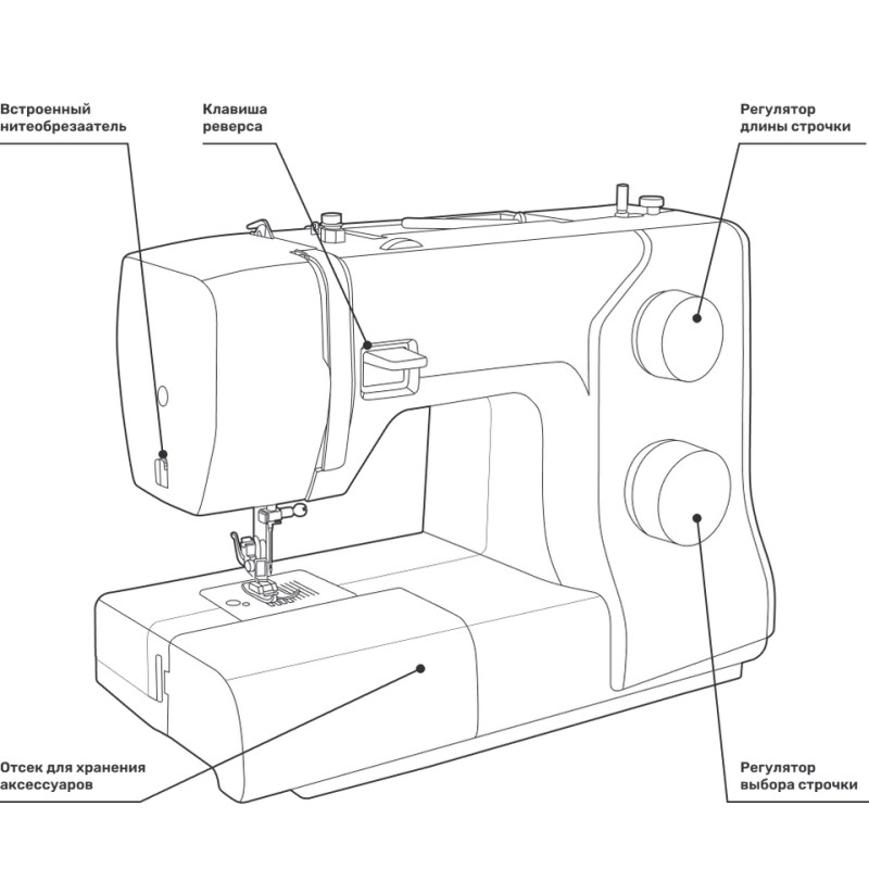 | Виды строчек | Декоративные, зиг-заг, оверлочные, потайные, прямая, эластичные и другие |