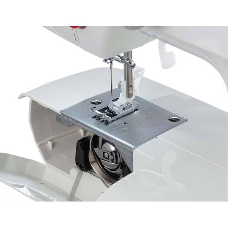 Несмотря на свой небольшой формат, VERITAS Janis порадует своим функционалом не только начинающих любителей шитья, но и станет незаменимым помощником в решении универсальных швейных задач. Если вы хотите проработать узкие детали, воспользуйтесь рукавной панелью съёмного столика, дополнительный подъём лапки позволит шить многослойные изделия. Для выполнения закрепки или штопки используйте клавишу реверс. Для комфортной работы в комплекте идут все необходимые аксессуары.