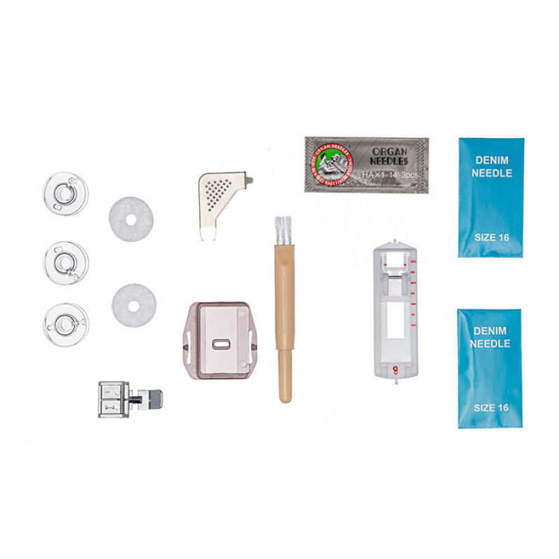 | Комплектация с завода | Универсальная лапка Рамка для полуавтоматической петли Лапка для вшивания молнии Штопальная пластина Шпульки Отвёртка-ключ Войлочная прокладка - 2 шт. Набор игл Organ Набор игл для джинсы - 2 шт. Вспарыватель / щёточка для чистки Педаль |